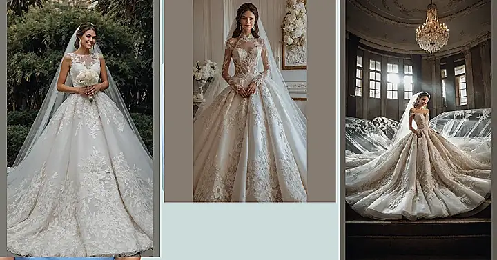 Thinking about ‘dream wedding dresses’ often brings images of gowns that are, well, pretty extra! This one in the photo looks like it could float away on a breeze if it weren’t for the serious amount of fabric. It’s got layers upon layers, lace everywhere, and enough sparkle to compete with a disco ball. Honestly, wearing this might feel like being wrapped in the fanciest, biggest duvet cover ever made, but way more stylish and probably a lot heavier.