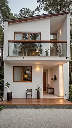This isn’t your average “matchbox” house; it looks like a super cool puzzle piece that just landed here, definitely earning its “unique house design” badge. With its crisp white walls and those sleek wooden accents, this place is basically a minimalist dream – probably owned by someone who likes things neat and loves a good geometric angle. My favorite part has to be that glass-fronted balcony upstairs. You could practically host a live-action chess game up there, or at least watch your neighbors from a super chic vantage point. Forget boring fences; this house is all about transparent boundaries and showing off its modern flair, even down to that neat little wood-paneled roof edge!