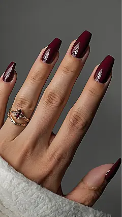 But wait, there’s more than just awesome color! Take a closer look at that ring finger – it’s rocking a fancy gold pattern that looks like it belongs in a royal palace or a super cool vintage movie. It’s like your nails decided to throw a tiny, glamorous party and invited all the bling. Who needs boring nails when you can have this level of fabulousness? These designs are total maroon nails inspo, proving you can be super chic without losing your sense of fun. So go ahead, screenshot this look and prepare for all the compliments – your hands are about to become the main event!