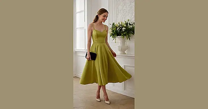 This vibrant lime green dress is basically a walking party invitation, perfect for celebrating a big wedding day! With its flowy skirt that’s just begging for a good twirl on the dance floor and that sweet v-neckline, you’ll look absolutely radiant. It’s the kind of outfit that says, “I’m here to celebrate the happy couple, enjoy all the cake, and maybe even show off some killer moves without my dress getting in the way!” Just be careful not to blend in too much with the spring decor, unless the bride specifically requested you resemble a fancy garden gnome.