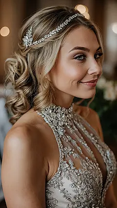 How do you make shoulder-length hair feel super special for a wedding without it just hanging there like you just rolled out of bed (even if you did)? This amazing look totally nails it! See how those gorgeous blonde curls are swept up and pinned in a way that looks elegant but also super fun? It’s like, “Yeah, I can dance all night and my hair won’t betray me.” Plus, that sparkly headpiece is basically shouting, “I’m here for the party, and I brought my A-game!” It’s perfect for a bridesmaid who wants to look fabulous but also needs to chase flower girls or help the bride with her dress without getting hair in her face.