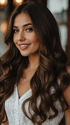 Just look at that hair! It’s not just brown; it’s like someone brewed the perfect cup of coffee, then styled it into these amazing, bouncy waves. That rich brown hair color is so deep and shiny, it practically glows, making you want to reach out and give it a high-five. It’s the kind of hair that looks effortlessly cool, as if she just rolled out of bed looking this fabulous, and it totally matches her bright, friendly smile that could probably convince a grumpy cat to purr.