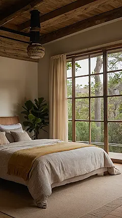 This bedroom is so relaxing, it practically begs you to crawl under the covers and hibernate until spring! The gorgeous wooden beams on the ceiling are like a cozy treehouse, and those soft, earthy tones? They’re practically whispering, “Come on in, it’s time for a nap.” The art on the walls is like a botanical garden for your eyes, making you feel calm and connected to nature. Forget counting sheep – you’ll be counting the beautiful wood grains instead!