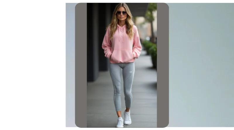 You know that feeling when you want to look effortlessly cool but also like you could break into a spontaneous dance battle or sprint for the last slice of pizza? This outfit gets it! Our model here is rocking a super comfy pink hoodie and sleek gray leggings, proving that active wear outfits aren’t just for hitting the gym. She looks ready to conquer the day, whether that means a super intense workout (maybe) or just expertly navigating the snack aisle at the grocery store. It’s the perfect blend of “I woke up like this” and “I totally put thought into looking this good… by throwing on a hoodie.”