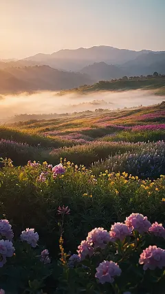 Whoa, hold up. If you’re tired of seeing the same old boring background every time you unlock your phone, prepare yourself. This picture is basically Mother Nature showing off, complete with misty mountains that look like they’re still in bed, and a whole field of flowers throwing a vibrant, colorful party. Pinks, purples, and yellows are popping everywhere under that dreamy, soft sunlight. It’s like a peaceful escape button for your brain, especially when you’re trying to avoid that mountain of homework. This is peak “aesthetic wallpaper” material right here, no doubt about it.