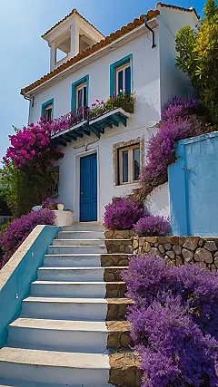 Imagine stumbling upon this place! It’s like a real-life postcard, but way cooler. Someone definitely put a lot of work into making this house pop with all those vibrant purple flowers. It’s no wonder a photographer would want to capture this view – it’s like nature and architecture had a baby, and that baby turned out to be super photogenic.
