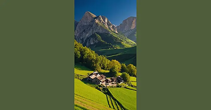 This picture is like a postcard from a fairytale! Imagine living in a cozy village nestled in a valley, surrounded by rolling green hills that look like giant, fluffy carpets. The mountains tower above, looking like grumpy giants guarding their precious little village. It’s the perfect place to grab your camera and capture some seriously beautiful nature photos – I bet the sunsets here are absolutely stunning!
