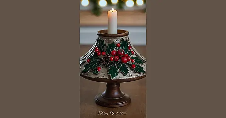 This Christmas candle holder is way more festive than your grandma’s crocheted doily! Look at those adorable holly berries and leaves – they’re practically shouting “Merry Christmas!” It’s like a tiny, charming winter wonderland perched on a dark wood base, ready to add a touch of whimsy to your holiday decor. Imagine the warm, flickering candlelight casting magical shadows on your Christmas tree… it’s almost enough to make you believe in Santa!