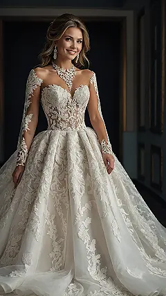 This dreamy wedding dress looks like it was spun from moonlight and fairy dust, seriously! It’s got lace everywhere, long sleeves that are all delicate and intricate, and a skirt that just goes on and on, perfect for twirling… carefully. You’d feel like royalty, maybe even a little magical, but let’s be real, you’d also be mentally calculating how much space this thing takes up and praying nobody accidentally steps on the train. Forget sneaking seconds at the buffet, this dress is a whole event on its own!