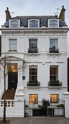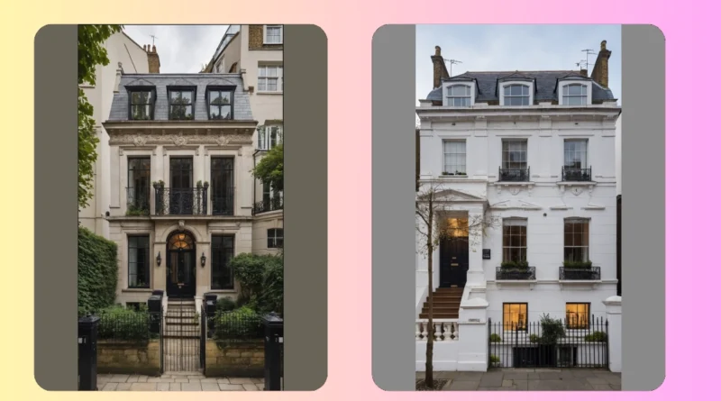 This isn’t just any London house; it’s practically a celebrity in brick and plaster, standing tall with its dazzling white coat like it’s ready for a magazine photoshoot. You can almost hear it whispering tales of tea parties, perhaps a very polite argument or two over who gets the last scone. With those cute dormer windows peeking from the roof, it looks like the house is wearing little hats, probably to keep its historic brain warm from the chilly English weather. And check out those tiny iron balconies – perfect for pretending you’re royalty waving to your subjects, or more realistically, for a couple of very well-behaved potted plants to sunbathe.