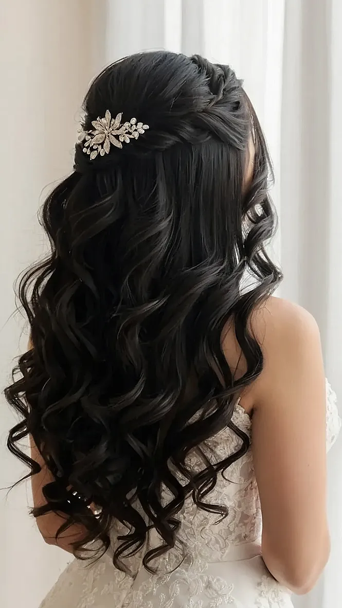 Imagine walking down the aisle looking like *this*! This hairstyle is like the perfect blend of classy and carefree, you know? Half-up, half-down, and those amazing waves are giving major mermaid vibes. Plus, that sparkly hairpiece? It’s like a tiara for people who want to be a princess, but also want to be able to move freely and dance at their reception without their crown falling off every five seconds.