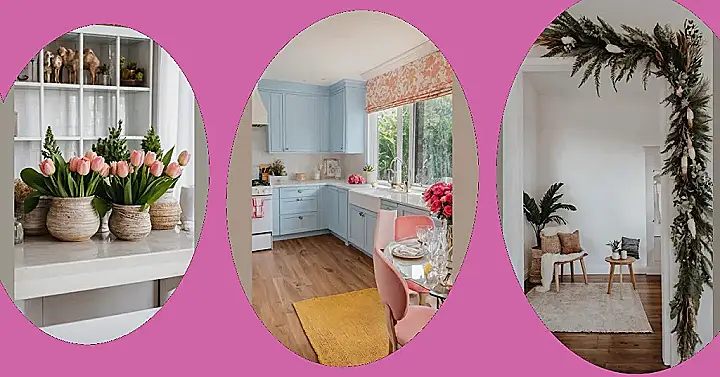 Stepping into this kitchen is like getting a burst of sunshine, even if it’s pouring rain outside! Those calm blue cabinets are already super inviting, but then the flowers come in and crank the happy meter all the way up. From the giant bouquet of pink roses ready to party on the dining table to the smaller pops of color near the sink and stove, these home flower decors are basically guaranteeing good vibes. It’s like they’re whispering, “Don’t worry, even if you accidentally use salt instead of sugar, at least we look fabulous!”