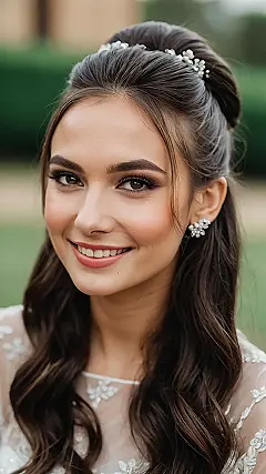 Imagine walking down the aisle looking like *this*! This hairstyle is like the perfect blend of classy and carefree, you know? Half-up, half-down, and those amazing waves are giving major mermaid vibes. Plus, that sparkly hairpiece? It’s like a tiara for people who want to be a princess, but also want to be able to move freely and dance at their reception without their crown falling off every five seconds.