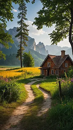 Check out this view! That mountain in the back is so huge and craggy, it looks like it’s made of giant, ancient cookies that no one can reach. And look at that winding dirt path leading right towards that cozy little cabin – you just know there’s something awesome waiting there, maybe a friendly squirrel delivering mail or a secret stash of board games. This picture is so crystal clear, you can practically smell the fresh mountain air. It’s totally the kind of pretty HD image that makes your screen look instantly cooler than everyone else’s.