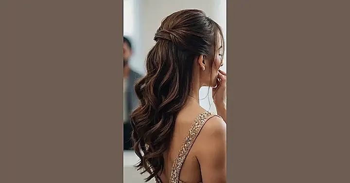 The picture shows a chic half-up, half-down hairstyle. It’s kind of like the perfect compromise between a messy bun and a flowing mane. Imagine your hair saying “I’m ready for the dance, but I’m also not afraid to let my curls bounce.” This look is totally trendy, and it’s super versatile too!