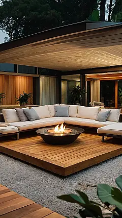 The wood floor and the fire pit give it a rustic, nature-y vibe that’s super trendy right now. It’s like bringing the cozy feeling of your living room outside, with a touch of natural elegance. This picture screams “relax and enjoy” and that’s a feeling that everyone can appreciate, no matter what your style is.