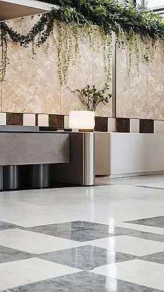 But wait, there’s more to this design party than just the floor! Notice how the walls are rocking their own textured tiles, with lush green plants spilling down like nature’s very own, super chic curtain. It’s like a cool modern hangout spot decided to invite a secret garden indoors, creating a vibe that’s both fresh and futuristic. Even the sleek counter and the glowy lamp are in on the trend, making this whole space feel like a perfectly put-together outfit where every piece just works.