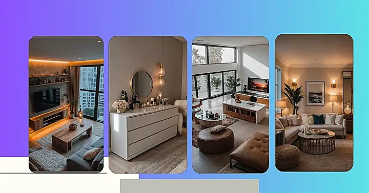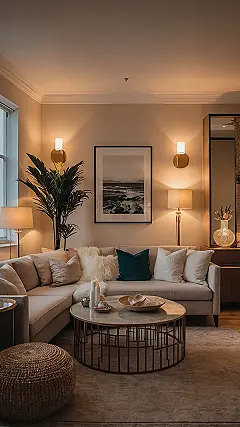 This living room practically screams “aesthetic goals” louder than your alarm clock on a Monday morning! With all those super comfy-looking cushions and that fluffy throw blanket, it’s basically daring you to plop down and never move again. The warm lighting from all those lamps and cool wall sconces makes the whole place glow like a golden hour filter, making even a monster-sized plant look like a supermodel. This is the kind of spot where you’d expect a fancy cup of cocoa to magically appear in your hand while you’re chilling.
