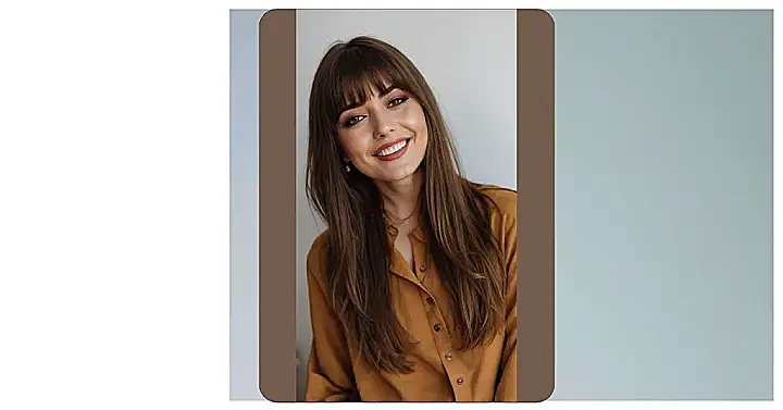 Gazing at this picture, you can’t help but notice that awesome, radiant smile, right? But hold up, let’s talk about the unsung heroes framing that grin: those perfectly styled curtain bangs! They’re not just any bangs; they’re like the VIP ropes for your face, gently guiding attention to all your best features. They flow so effortlessly, giving off major “I woke up like this, but still fabulous” vibes, and totally make her long, lovely hair pop even more. Who knew a little bit of hair could have so much star power?
