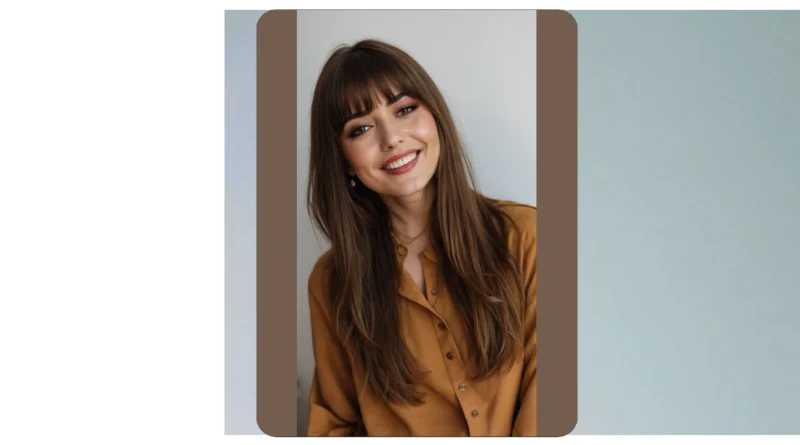 What’s super neat about curtain bangs, as you can see with our model here, is how they perfectly highlight your eyes and cheekbones without covering everything up. They’re like a stylish peek-a-boo for your best features! Whether you’ve got super long hair like hers or even a shorter bob, these bangs just work. No more trying to pin back rogue strands that refuse to behave. They’re the superhero of bangs, swooping in to save your face from looking anything less than fabulous. So if you’re tired of the same old look and want a little hair refresh that says “I’m cool, I’m stylish, and I probably didn’t even try that hard,” then curtain bangs might just be your next hair adventure!
