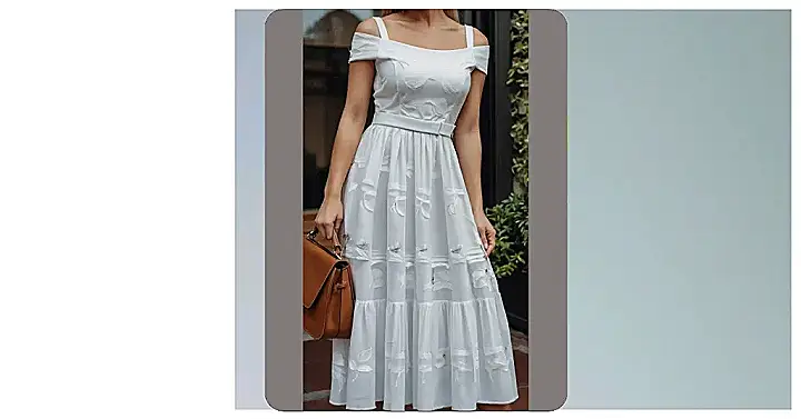 This dress is so elegant it practically has its own theme song! It’s like something you’d wear to a fancy garden party, or maybe even to finally meet your crush’s parents. The midi length is perfect because it’s not too short that you feel awkward bending over, and not so long that you trip all the time.