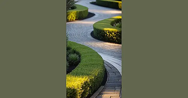 This front garden landscape looks like it’s ready for a royal parade, doesn’t it? Those perfectly trimmed hedges aren’t just for decoration; they’re clearly judging every step you take, making sure you stay on the beautifully paved path. With all those different-sized stones, it’s like a giant, fancy jigsaw puzzle designed to impress anyone walking by. You could probably host an entire fashion show here, or at least pretend you’re a secret agent on a super important mission just to get to the front door.