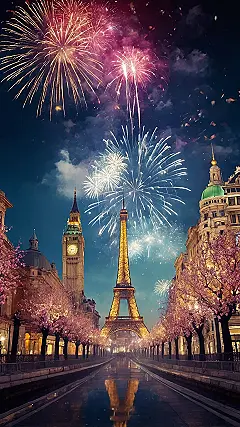 Now, let’s talk about this wallpaper’s secret superpower: it’s got the Eiffel Tower and Big Ben chilling together like old friends, proving that anything is possible when you’re celebrating New Year’s! Maybe Big Ben finally got its passport stamped, or the Eiffel Tower decided to visit London for a change – either way, it’s a magical mash-up under a sky full of pink and blue fireworks. This isn’t just a pretty picture; it’s a whole mood that says, “My dreams are so big, they can fit two iconic cities and a sky full of glitter on my phone!” Plus, those pretty flowering trees add a touch of sweet charm, making it the ultimate dreamy background.