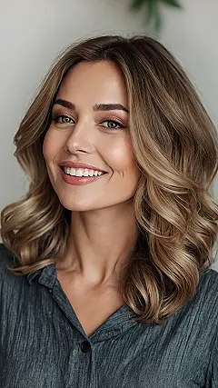 Look at that smile! She looks like she just conquered the world or maybe just had the best hair day ever. You know that glow you get when your hair feels amazing? Maybe she’s been on a quest for years, possibly trying out more than fifty different haircuts, from tiny trims to drastic chops, wild colors, and everything in between, finally landing on this gorgeous wavy style. It’s like her hair has its own adventure story, and this look is the happy ending!