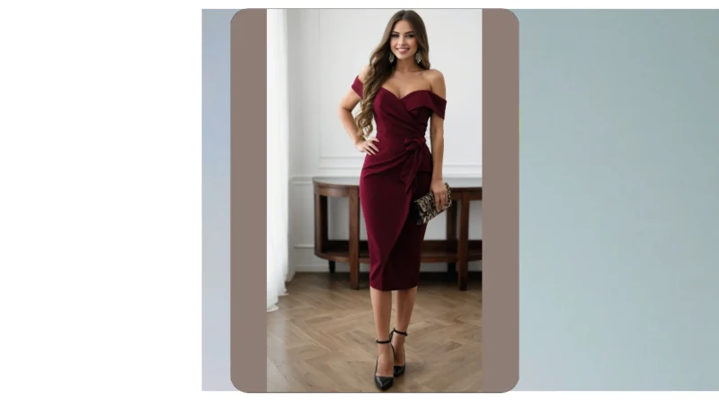 So, the holiday party invites are piling up, and suddenly you’re wondering if your favorite hoodie counts as ‘festive casual.’ Fear not, because this maroon masterpiece is here to save the day! This off-the-shoulder stunner looks ready for all the sparkly decorations and maybe a little mistletoe mischief. Plus, with that chic clutch and those dazzling earrings, you’ll look so put-together that no one will suspect you spent twenty minutes trying to decide between sweatpants and actual pants. You’ll be the one people stare at (in a good way!), probably wondering if you actually *like* fruitcake.