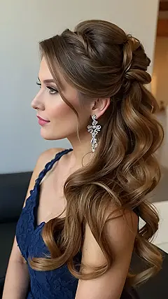 So, you’re a bridesmaid, huh? Awesome! Let’s be real, nobody wants a super complicated hairstyle that takes longer than the actual wedding ceremony. This look is perfect because it’s pretty simple, but still feels fancy. The half-up style with those soft waves? It’s like saying, “Yeah, I woke up like this… and then I put in this super cute hair accessory.” You can totally dance the night away without worrying about your hair turning into a hot mess.
