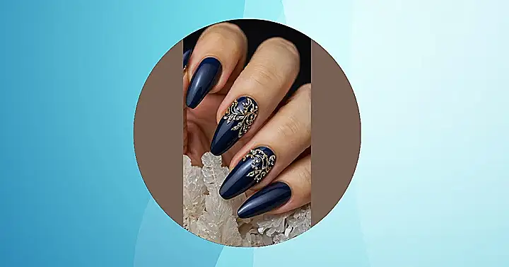 Who said fall nails had to be all about pumpkin spice orange? These incredible deep blue nails are here to tell those basic colors to step aside! They’re so dark and mysterious, it’s like they absorbed all the cool evening vibes of autumn, making them perfect for cozy sweater weather. And peep those fancy gold vine details with all the sparkly bits – they’re basically miniature jewel-encrusted branches that decided to make your nails their new, very chic home. Get ready for everyone to be asking if your nails just dropped from a fancy fall fashion magazine!