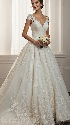 Check out this absolute showstopper of a dress! It’s got that perfect ivory glow, making the whole vibe feel super elegant without being too bright. And the lace? Oh my goodness, the lace is everywhere, like someone sprinkled a magical, fancy doily factory all over it. From the sleeves that look delicate as anything to the V-neck that’s just right, this dress is basically saying, “I woke up like this, fabulous!” It’s definitely the kind of outfit that makes you feel like you’re starring in your own romantic comedy, even if you’re just standing in a field looking gorgeous.