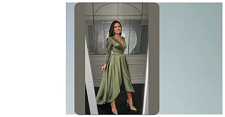 This fancy dress is so smooth, you could probably ice skate on it! Imagine showing up to a party looking like an elegant olive, but, like, the super sparkly, high-fashion kind of olive. You could even wear it to a school dance and confuse everyone into thinking you’re some kind of super-important diplomat from a fancy country where everyone dresses in avocado green.
