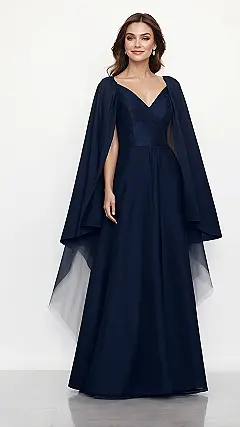 Forget capes being just for superheroes; this amazing navy dress proves they’re totally for wedding moms too! Your mom could totally rock this outfit, gracefully gliding through the ceremony, probably even catching a rogue bouquet with one hand and still looking absolutely fabulous. It’s the kind of dress that says, “Yes, I’m here to celebrate, but also, don’t mess with my kid’s big day!” Plus, that flowy cape detail is perfect for making a dramatic entrance or just making sure everyone knows who’s in charge of the good vibes.