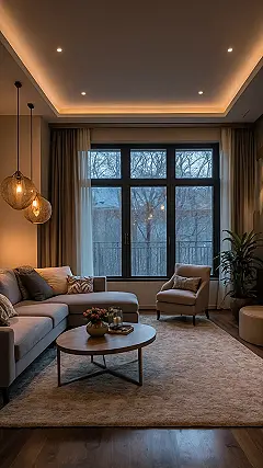 Now, peek outside that big window – it’s giving major “bare trees and possibly a snow day” vibes, which usually screams ‘moody.’ But thanks to this room’s brilliant lighting, you’d never feel gloomy! Those subtle, glowing lines tucked up in the ceiling create a soft, magical halo effect that makes the whole room feel like a giant, cozy hug. It’s almost like the lights are winking, saying, “Who cares what’s happening out there? We’ve got the ultimate comfy hideout covered in here!” So whether you’re trying to find that lost phone charger or just want to crash, these living room lights make sure your space is always bright, warm, and ready for whatever your chill time demands.