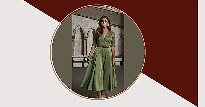 That olive green is so stylish, it’s like the dress grew right out of a super-trendy garden. This outfit is a perfect women fancy dress choice, that is simple but can also be styled up by adding more accessories. Plus, the brown belt is such a cool touch, making it look like a super elegant utility belt for carrying emergency snacks and your phone!