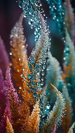 Check out this picture – it’s like nature decided to raid a jewelry box and sprinkle all the gems onto these fantastic plants! Those water droplets aren’t just boring old water; they’re tiny, perfect little spheres, sparkling like a million mini disco balls caught mid-drop. With these super vibrant colors, from electric blue to warm orange, it’s practically begging to be your new phone background. It’s so pretty, you might just get distracted trying to count all the glittery bits instead of, you know, doing actual work.
