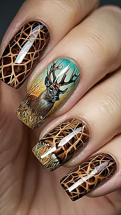 Forget boring plain colors, because these nails are totally buck wild! Just peek at that amazing middle nail – it’s not just a deer print, it’s like a tiny, super detailed portrait of a majestic buck, antlers and all, chilling in its natural habitat. Honestly, it looks so realistic, you might expect it to give a little wink or try to munch on some invisible grass right off your finger. These ‘Deer Print Nails’ are definitely going to make you stand out from the herd in the best way possible!