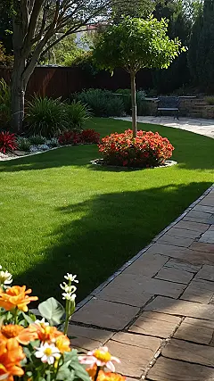 This backyard is seriously goals! Imagine chilling out after school, maybe with a book or some snacks, right there on that gorgeous lawn. The bright red flowers add a pop of colour, like a natural confetti party, while the perfectly manicured grass screams “relax and unwind”. It’s the kind of garden that makes you want to grab a lemonade and just soak up the sunshine – a true home front garden paradise.