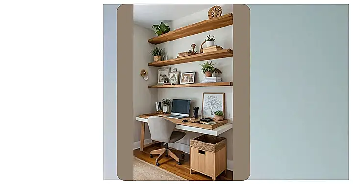 This home office design looks like something straight out of a Pinterest board! Those wooden shelves are practically begging for a mini plant collection, and let’s be honest, they’re probably holding up a few textbooks and maybe even a hidden stash of snacks. This space is like the adult version of a fort, except instead of pillow fights, you’re conquering homework or finally writing that short story you’ve been putting off.