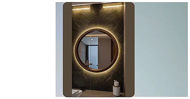 Forget those dull, boring bathrooms where you barely want to spend five minutes. This place? It’s like your personal spa, but without the awkward robes! Look at that fancy round mirror, probably judging your bedhead in the best possible way, framed by those cool warm lights that actually make you look good, unlike the harsh fluorescent ones at school. The mix of those wood-look and grey tiles gives it such a chill vibe, you might actually *want* to spend extra time practicing your TikTok dances or perfecting that winged eyeliner here.