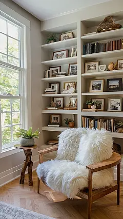 Imagine having a home office so cozy, it feels like you’re working in a cloud! Seriously, that chair looks like it’s made of the fluffiest sheep ever. This space isn’t just about getting work done; it’s about doing it in style and comfort. You could probably spend hours just curled up there reading instead of, you know, doing actual homework or spreadsheets.
