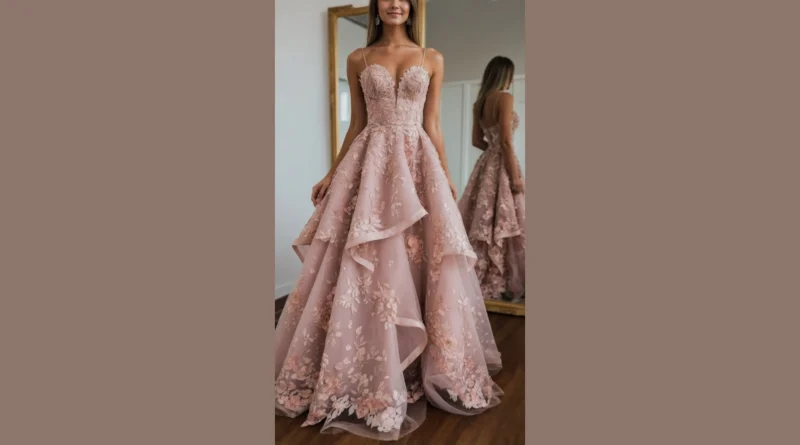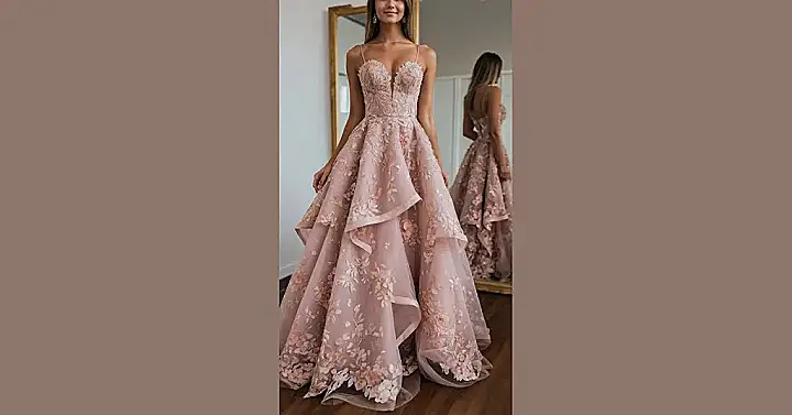 Prepare to be the absolute star of the homecoming dance in a dress that’s practically a walking garden of awesomeness! This stunning blush gown, completely covered in intricate floral details, is so dreamy you might just float across the dance floor. Just imagine those gorgeous, ruffled layers swishing and swaying with every single one of your moves – you’ll be sparkling so much, everyone will want to know where you found such a perfectly cute and enchanting dress!