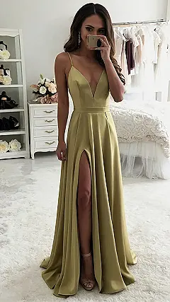 This olive green bridesmaid dress is seriously stunning! Imagine yourself looking this chic and confident as you stand by your bestie on her big day. It’s the perfect blend of elegant and effortless – flowy enough to dance the night away, but sleek enough to make you feel like a total queen. Plus, that leg slit? It adds just the right amount of wow factor without being too much. You’ll be the best-dressed bridesmaid (don’t tell the others!).