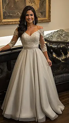 This dress is seriously stunning! Imagine yourself as a bridesmaid in this gorgeous, champagne-colored gown. It’s like something straight out of a fairytale – all swishy satin and delicate lace sleeves. You’d feel like a total princess, even if the only royal event you’re attending is your best friend’s wedding. Plus, you’ll be the most stylish bridesmaid, hands down! Forget about fighting over who gets to wear which dress; everyone will want this one.