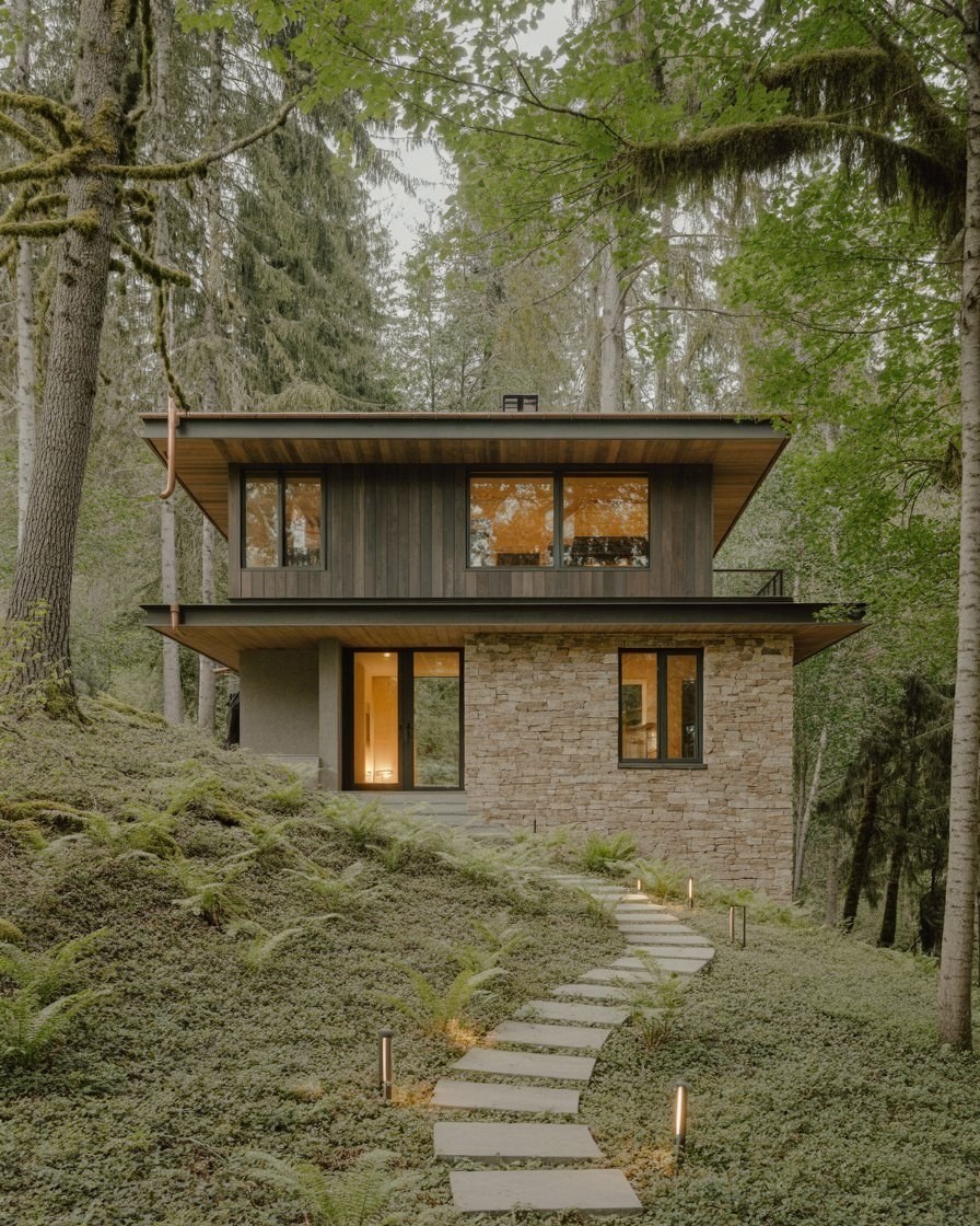 #4 Modern Two-Story Stone House: Dusk Illumination & Forest Views