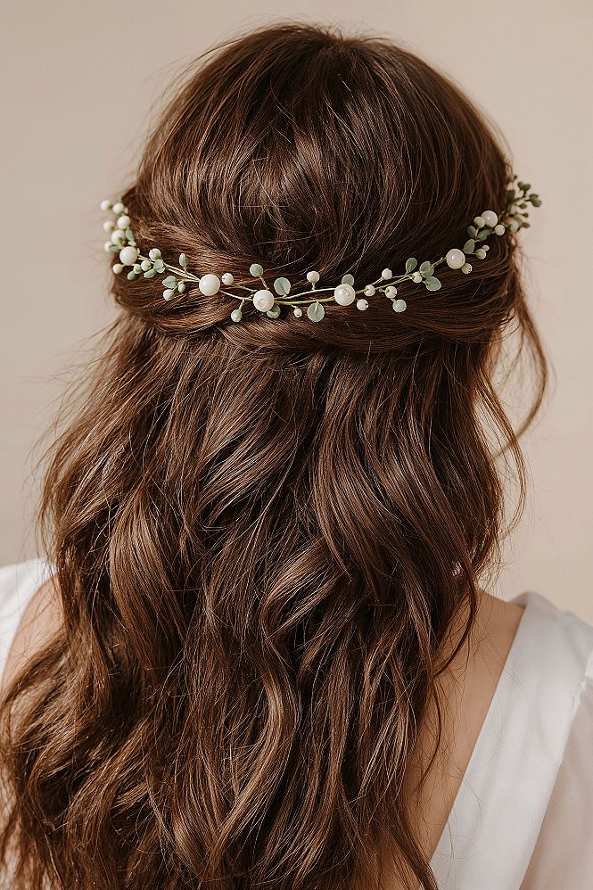 Capture a whimsical, romantic aesthetic with this stunning half up hair style, adorned with delicate vine and floral accents. This wedding hair half down option frames the face beautifully, showcasing elegant waves for a truly enchanting bridal look.