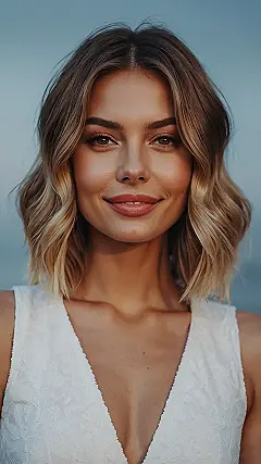 This girl’s got the perfect mid-length bob, right? It’s like she just rolled out of bed looking amazing – no fuss, no muss, just effortless beauty. Her hair is perfectly tousled, with just the right amount of volume and texture. Plus, her smile is so bright, it could light up a whole room!
