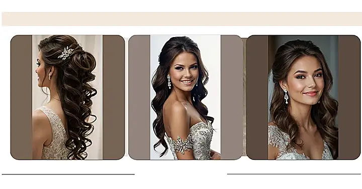 This hairstyle is like a fairytale come to life! Imagine yourself walking down the aisle, hair flowing like a waterfall of gorgeous curls, with a sparkly headpiece that looks like it’s made of tiny stars. It’s totally boho chic, perfect for a bride who wants to look amazing but also comfy and relaxed – not stiff and formal like a princess in a glass case! Think less “royal wedding” and more “garden party,” but still super stunning.