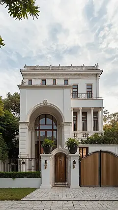 This big white house is what they call a neoclassical villa, which basically means it’s trying really hard to look like a cool, old-school Roman or Greek building but with slightly less toga action happening inside. Look at that massive arched window that’s probably bigger than your entire bedroom wall, and all those columns standing around looking fancy like they’re waiting for a historic photo shoot. It’s so grand and white, you might feel like you need a passport just to walk past the front gate, which, by the way, looks like it belongs to a secret garden or maybe guards a hoard of ancient pizza recipes.
